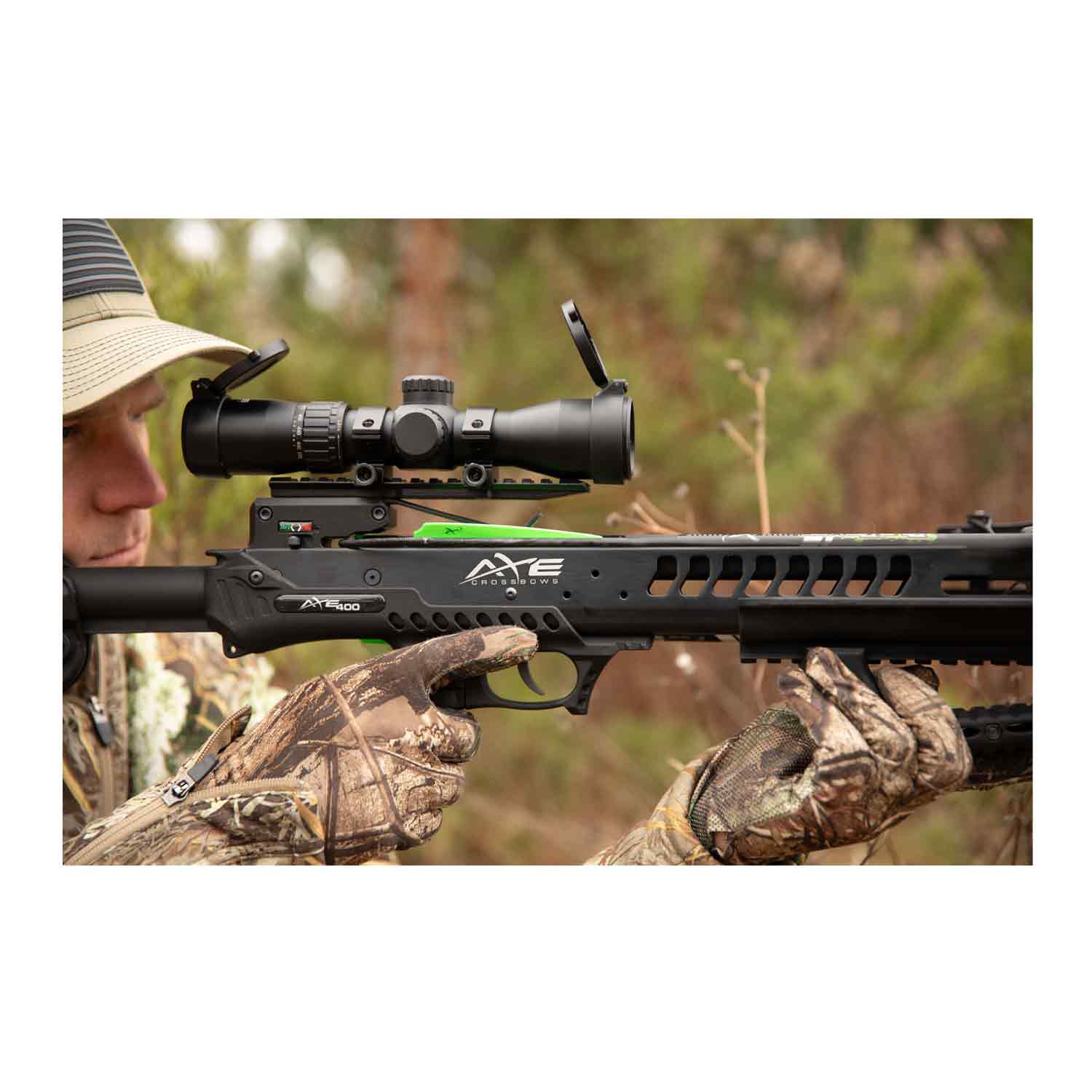 Sending crossbolts down range at a deadly 400 feet per second, the AX400 delivers on the high-end performance users have come to expect from AXE Crossbows — without a high-end price tag. Light weight, compact, ambidextrous, and extremely adjustable, this crossbow offering leaves nothing to want. With a state-of-the-art ambidextrous safety mechanism and patented Anti-Dry Fire feature, the AX400’s trigger is just one of the many safety and performance-driven metrics. This bow’s backbone is a multi-position buttstock, easy step through foot stirrup, and an ergonomic/adjustable foregrip the stock resembles those found on high end tactical firearms. The extruded aluminum rail is designed for repeatable accuracy and pairs perfectly with ultra-durable 200-pound compression molded limbs to deliver feel and function sought after by today’s demanding hunters. The quiver mounting system holds tight against the stock for an improved and streamlined fit and better overall aiming. A premium AXE optic is matched to the crossbow’s ballistic profile with a 4X multi-reticle scope with precision windage and elevation adjustment that’s sturdily mounted to a cantilever-style mount above the rail. Dual string suppressors and limb dampeners help improve accuracy and eliminate noise while keeping the 400 dead-in-the-hand.