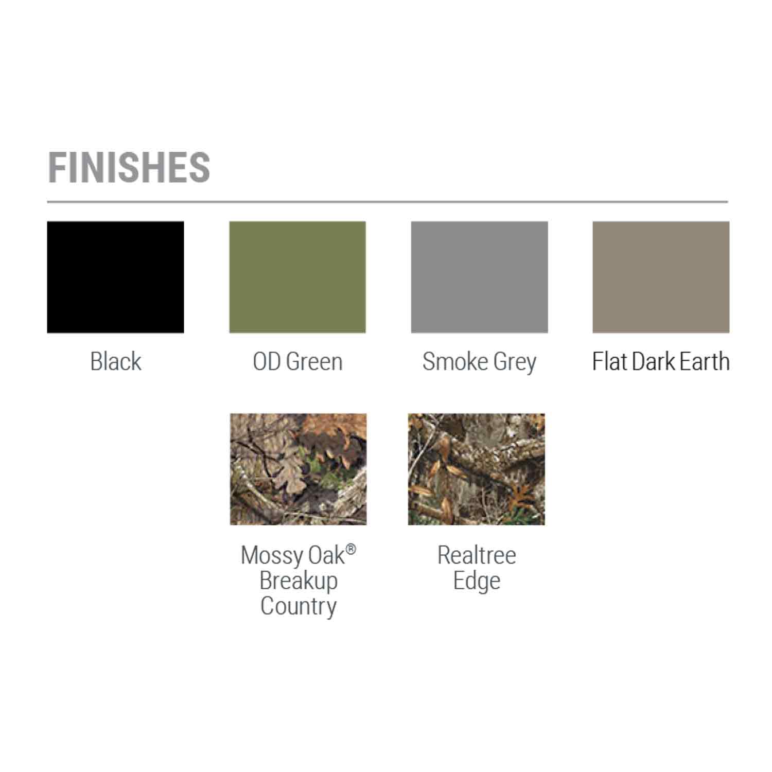 - Offered in Black, OD Green, Smoke Grey, Flat Dark Earth, MossyOak Breakup Country, and Realtree Edge