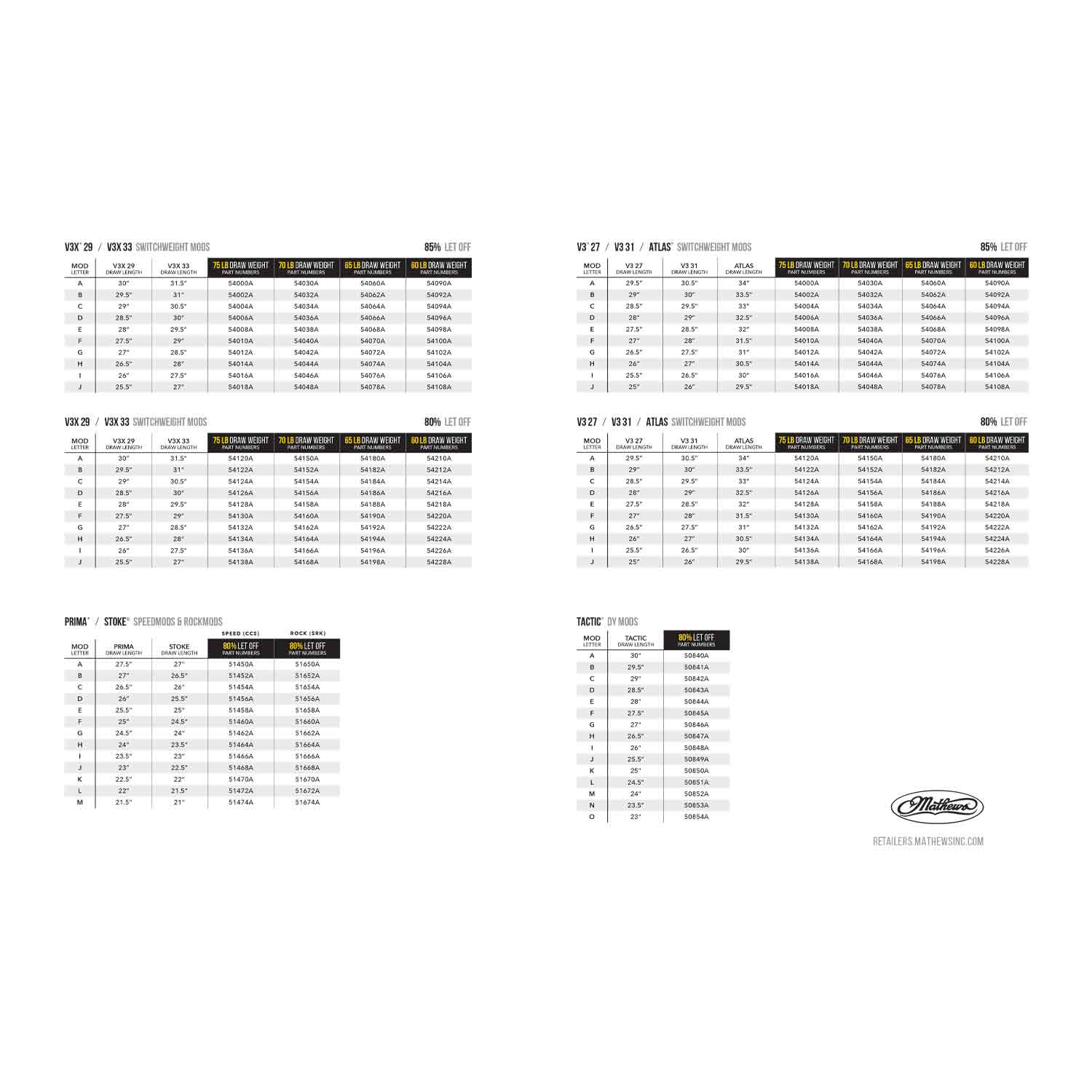A wide range of draw lengths, these mods ensure maximum speed and comfort whatever your draw length or pursuit. With so many specifications available, Mathews SW mod system was designed to make sure your bow and your setup work as efficiently and effectively as possible.